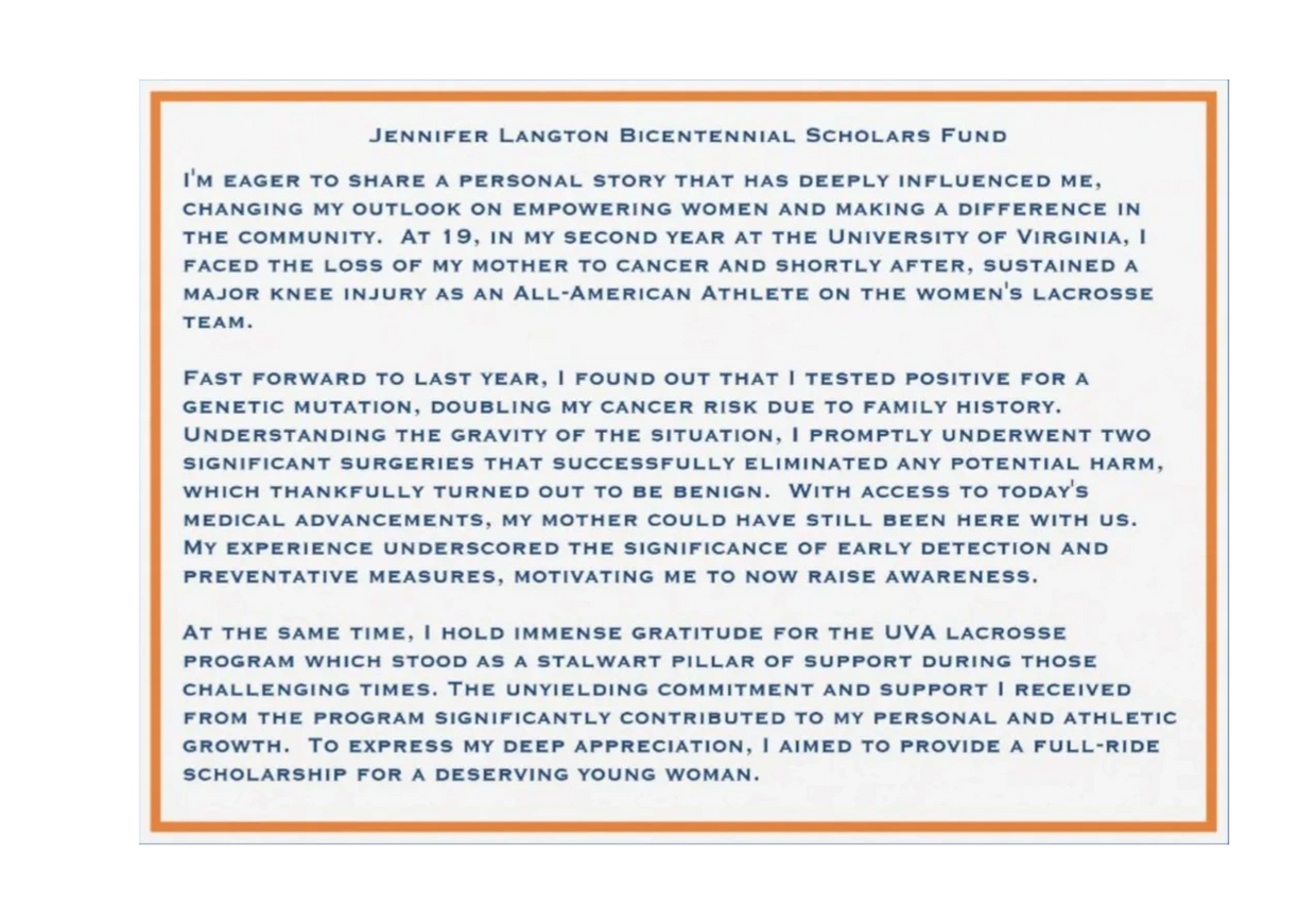 AN ENDOWED SCHOLARSHIP IS ONE OF THE MOST POWERFUL INVESTMENTS MADE FOR VIRGINIA ATHLETICS. IT PROVIDES ONGOING FUNDING TO SUPPORT A STUDENT• ATHLETE'S SCHOLARSHIP AND IS A LASTING TRIBUTE TO HONOR THE INDIVIDUAL NAMED FOR THE ENDOWMENT